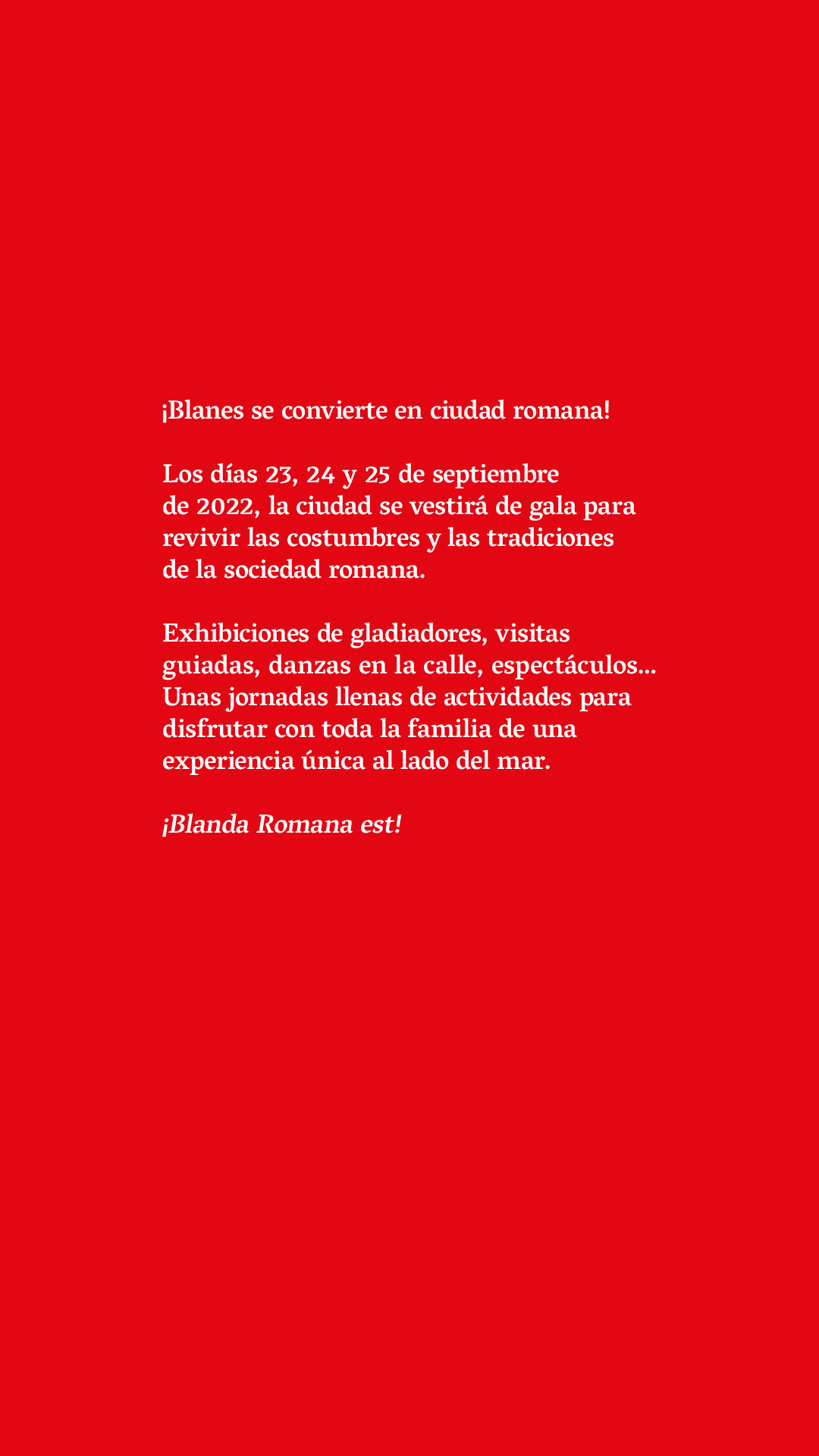 setembre, 2022 Blanda,-ae: Jornadas Romanas 23setallday25Blanda,-ae: Jornadas Romanas DescripcióJornadas Romanas Días: 23, 24 y 25 de septiembre Lugar: Passeig de mar Aquí el programa Descripció Jornadas Romanas Días: 23, 24 y 25 de septiembre Lugar: Passeig de mar Aquí el programa Datasetembre 23 (Friday) - 25 (Sunday) CalendarGoogleCal